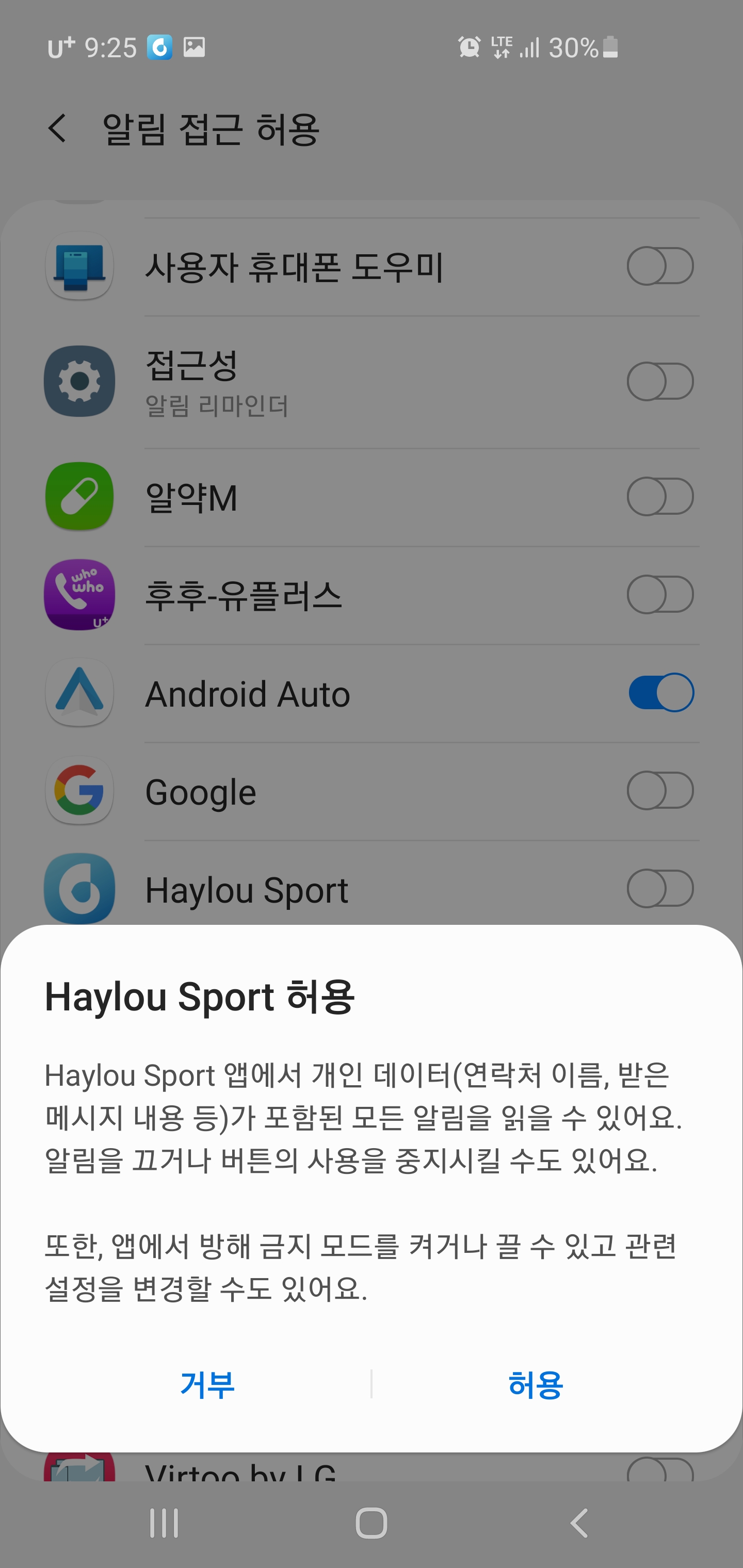 당연히 알림 접근은 허용으로 하고 알림접근 허용 항목에 Haylou sport항목도 위 사진의 안드로이드 오토처럼 파랗게 활성화시켜둔다.
